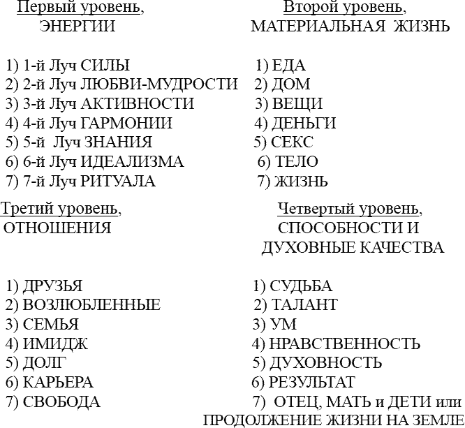 Подсознание похоже на стопки данных, внутри которых скрыты, но работают – различные негативные воспоминания и ошибочно усвоенные убеждения. Чтобы разобраться в том, что спрятано ниже поверхности сознания, наша земная жизнь детализирована и представлена в виде четырех больших уровней: ЭНЕРГИЙ, МАТЕРИИ, ОТНОШЕНИЙ и СПОСОБНОСТЕЙ, каждый из которых содержит по семь тем.