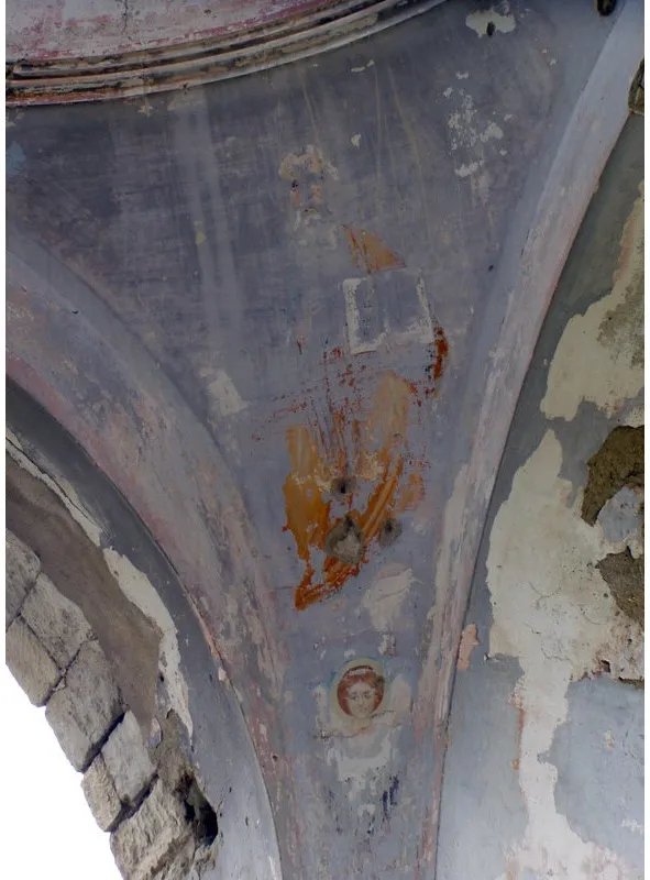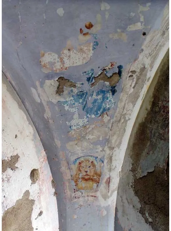 Видны были частично изображения евангелистов в виде старцев, настолько глубоко «впечатавшиеся» в штукатурку, что они остались, несмотря на то, что один из слоев штукатурки, а именно самый верхний, наружный, с росписью, был содран.