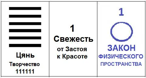 Первый блок содержит в себе графическое изображение гексаграммы, её мантрическое чтение и русский перевод её первой комментаторской оболочки. Эта информация, как и числовой порядок содержания картинки матрицы, взяты из книги Юлиана Константиновича Щуцкого «Китайская классическая книга перемен ИЦЗИН». Запись гексаграммы в двоичном коде пришлось сделать самой. Ну, это смог бы сделать любой ребёнок.