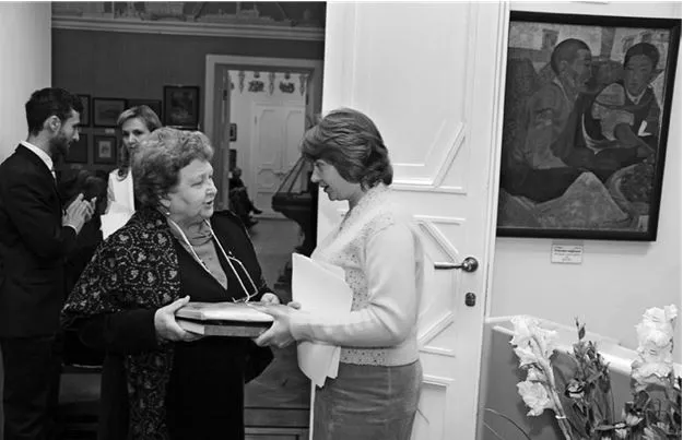 Журналистка М.В.Забровская (Чита) передает старшему научному сотруднику МЦР Н.Г.Михайловой документы, касающиеся Центрально-Азиатской экспедиции