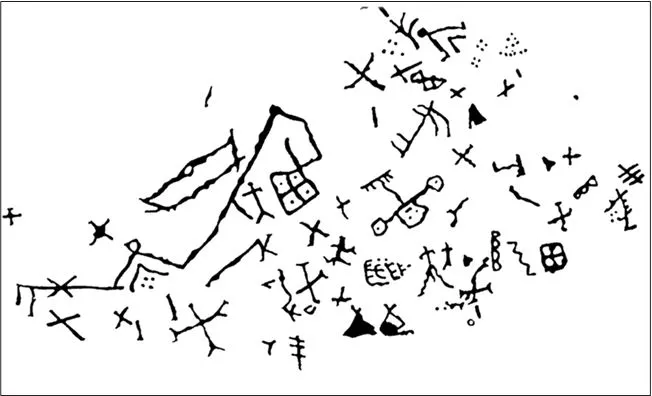 На этой картине, в левом нижнем углу, можно рассмотреть знаки, изображенные на наклонной каменной плите. Что же могут означать эти петроглифы? Они выглядят очень древними. Их можно принять за забытые, уже никому не известные письмена. Своим архаичным видом они придают таинственную сказочность изображенному на картине явлению. Возникает ощущение, что Царь Нагов, поднявшийся из глубин озера, невероятно древен, что он был всегда от начала времен, что изрекаемая им мудрость ужасающа своей первозданной глубиной и что принять ее может только действительно «Неустрашимый», каким был Нагарджуна.