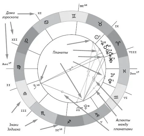 Натальная карта состоит из 10 основных планет, 12 домов и 12 знаков. Также планеты и дома соединяют 5 основных (мажорных) аспектов – линий во внутреннем круге карты, проведенных под определенным углом.
