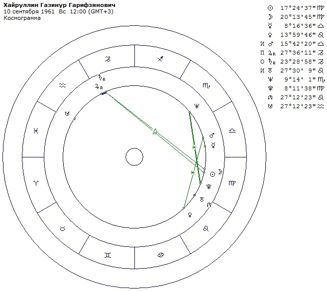 Обратимся к анализу космограммы Хайруллина Газинура Гарифзяновича. Данные: 10.09.1961 года рождения, 12:00 (GMT +3), Старое Дрожжаное, Татарская АССР, РСФСР, СССР.