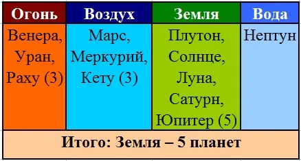 Общий взгляд на космограмму Газинура Хайруллина. Расположение планет по стихиям: