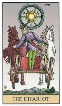 Карта говорит о хорошей мотивации к дальнейшим достижениям и совершенствованию профессиональных навыков. Дальняя дорога и путешествия. Поездки и перевозки. В некоторых случаях эта карта может говорить о военной службе или соревновательных видах спорта, где ваша задача – победить всех противников и преодолеть все препятствия. В конечном итоге это проверка на зрелость, неизбежная на пути к той или иной победе. Триумф, победа, смелость, честь, борьба, завоевание. Событие, способное поднять данного человека на еще одну ступень успеха. Ситуация контроля над ситуацией по этой карте часто весьма мнимая. Человеку кажется, что он управляет этой колесницей, но на самом деле он этого не делает (колеса висят в воздухе). Его подхватил и увлек поток, и теперь с большой силой несёт вперед.