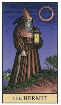 Отшельник символизирует следующую алхимическую операцию совершенствования вещества – осаждение (отделение взвесей от жидкости). На карте изображен философ, ищущий следы прошедших Путь до него. Ворон на плече означает стадию nigredo. В левой части карты (прошлое) мы видим замок, что говорит нам о том, что поиск информации в уютных залах библиотеки уже в прошлом, а сейчас искать нужно в «полевых условиях». В своей работе «О тщете искусств и наук» Агриппа Неттесгеймский высказался в следующем смысле: если кто-либо хочет что-либо уразуметь в себе самом и в мире, он должен, прежде всего, разувериться в книжном познании». В конце восемнадцатого века аналогичную мысль выразил Л.К. де Сен-Мартен.