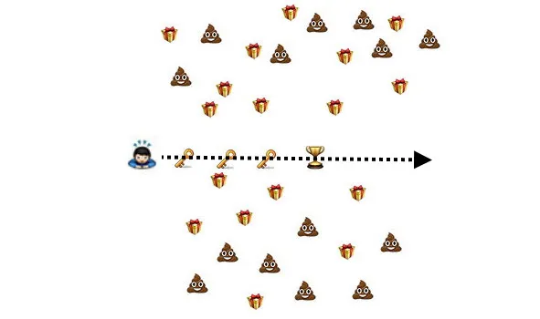 Но вот в чем заключается хитрость: возможности находятся только в непосредственной близости от вашей генеральной линии. И чем дальше вы уходите от своих актуальных целей, потребностей, от ваших сильных способностей и непосредственных обязанностей, тем больше вы хватаете не возможностей, а дурно пахнущих кучек. Эти картинки символизируют палки, которые вы сами вставляете себе в колеса. Это то, что вас сбивает. На них вы теряете энергию, не получая ничего взамен.