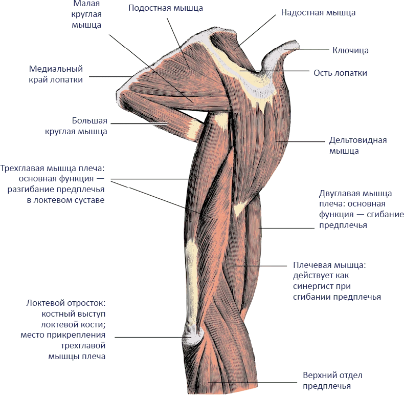 Рис. 1.1. Правая лопатка, плечо и верхний отдел предплечья; вид сзади и сбоку (Sappey)