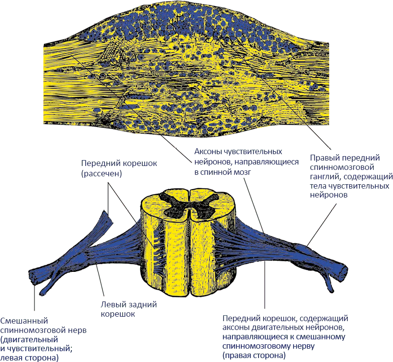 Мы ощущаем все происходящее в материальном мире посредством специализированных клеток, называемых нейронами, сто миллиардов которых находятся в одном только головном мозге; эти клетки направляют потоки информации по всему телу и внутри центральной нервной системы (головного и спинного мозга). Вся передача информации осуществляется всего лишь тремя типами клеток: чувствительными нейронами, которые переносят поток ощущений от периферической нервной системы (по определению, это все части нервной системы, находящиеся вне головного и спинного мозга) в центральную нервную систему и в сознание; двигательными нейронами, которые передают из головного и спинного мозга инструкции, предназначенные для периферической нервной системы; и вставочными, или ассоциативными нейронами, которые находятся между чувствительными и двигательными нейронами, – эти нейроны передают сигналы нашей воли и желаний двигательным нейронам. Сенсорная (чувствительная) информация поступает в задние рога спинного мозга через задние корешки, а двигательная информация выносится из передних рогов спинного мозга в передние корешки. Задние и передние корешки сливаются, образуя смешанные (двигательные и чувствительные) спинномозговые нервы, которые, в свою очередь, иннервируют все структуры организма (рис. 1.3–1.9).