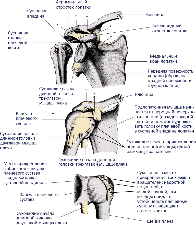 Превосходный пример суставной капсулы мы находим в плечевом суставе. Подобно тазобедренному, плечевой сустав является шаровидным – шар представлен головкой плечевой кости, входящей в суставную впадину лопатки (рис. 1.13). Весь этот комплекс одет суставной капсулой, содержащей сухожилия, которые проходят сквозь ее стенки или срастаются с суставной капсулой так же, как и связки, усиливающие сустав снаружи. Для того чтобы ощутить создаваемое капсулой сопротивление, поднимите руку над головой и попытайтесь отвести ее как можно дальше кзади: при этом вы сможете прощупать туго натянутую суставную капсулу и ее связки.