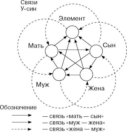 Теперь рассмотрим схему У-син в приложении к одному из элементов. Для удобства рассмотрим элемент «огонь», обозначив его так: «элемент». Все остальные элементы обозначим в полном соответствии связям в схеме У-син: «мать – сын», «муж – жена», «жена – муж».