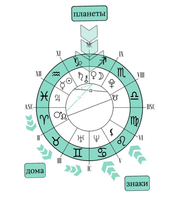 Средний круг – знаки зодиака. Знаки отвечают за то, как именно проявляются ваши внутренние функции. Это стиль, темперамент, энергетика. Индивидуальный способ действия и восприятия.