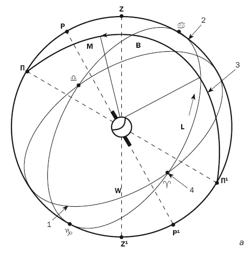Рис. 3. Системы небесных координат: а – эклиптическая:1 – небесный экватор; 2 – небесный меридиан; 3 – круг широты;4 – точка весеннего равноденствия