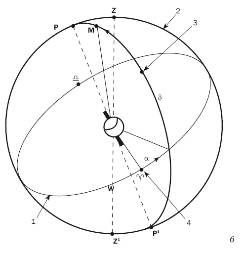 Рис. 3 (продолжение). Системы небесных координат: б – экваториальная: 1 – небесный экватор; 2 – небесный меридиан; 3 – часовой круг; 4 – точка весеннего равноденствия