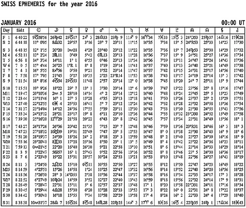 Посмотрите на самую первую строку: 1 января 2016 года. Найдите колонку Юпитера (значок этой планеты вы должны уже знать очень хорошо!). В первой строке вы видите числа 23 и 9, разделенные символом знака Девы. Это означает, что 1 января Юпитер был в 23 градусах и 9 минутах Девы. В каждом знаке зодиака 30 градусов, так что положение планеты, ее координаты в пределах знака могут иметь значение от 0 градусов 0 минут до 29 градусов 59 минут.