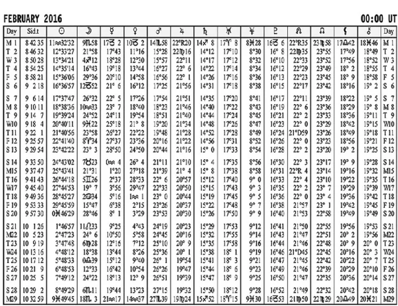 Рис. 7. 2. Таблицы эфемерид на февраль 2016