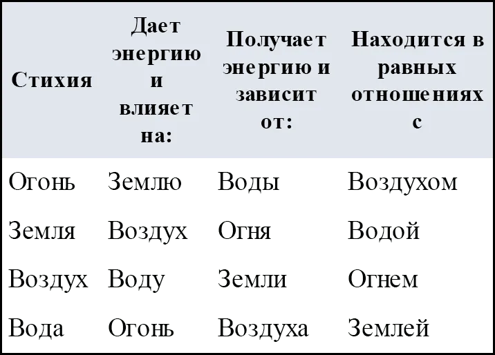 Таким образом, если у вас несколько планет в огненных знаках, то в присутствии людей, у которых есть планеты в водных знаках, вы будете испытывать оживление; ваши эмоции и действия будут во многом определяться чувствами этого человека. Кроме того, каждый знак влияет на последующие пять знаков, с шестым находится в равноправных отношениях и зависит от пяти остальных.