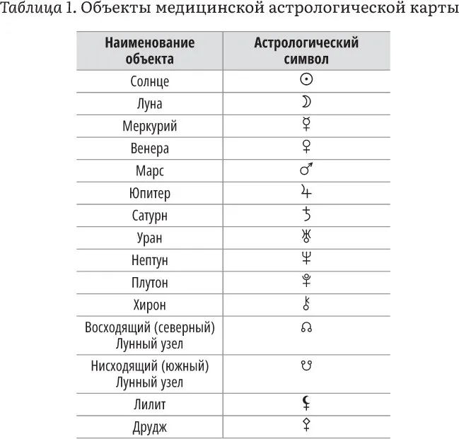 Поскольку медицинская астрология, как и другие виды астрологии, определяет состояние информационных полей космоса на основе расположения планет и некоторых других объектов Cолнечной системы, то именно эти объекты и являются главными фигурантами медицинской астрологической карты. Такими объектами выступают светила (Солнце и Луна), планеты Солнечной системы, некоторые планетоиды (Плутон, Хирон), а также объекты непланетарного типа, но имеющие характерное астрономическое и эзотерическое значение (лунные узлы, Лилит) (см. таблицу 1).