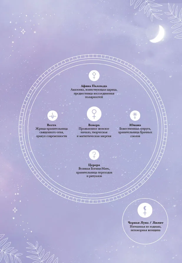 Нашей технической астрологической и архетипической базой станут мандалы женского начала, созданные Деметрой Джордж и Тони Вольф. От себя я добавила к ним Лилит, архетип непокорной Женщины, исходя из предположения, что она, будучи столь слабо интегрированной в нашу психику, до сих пор остается изгнанной из мандалы. Действительно, как мы увидим в главе, посвященной ей, астрологическая точка Черной Луны Лилит все еще порождает многочисленные споры. Аналогичным образом мифологическая фигура Лилит вызывает то восхищение, то неприятие, будто бы мы так и не достигли согласия на коллективном уровне, чтобы по-настоящему понять и принять ее.