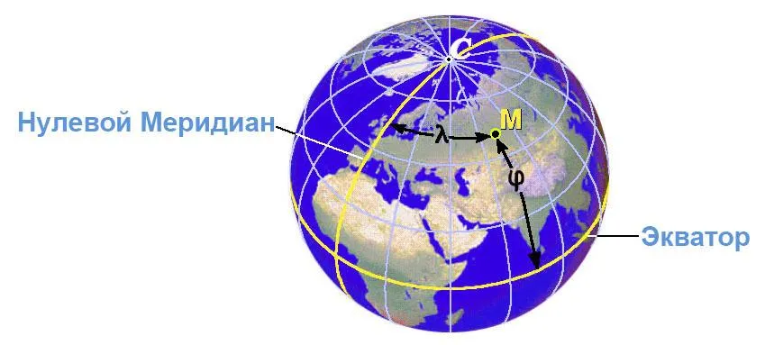 Географической долготой λ точки М (рис.1) называется двугранный угол между плоскостями, проходящими через Нулевой Меридиан и через Меридиан, проходящий через данную точку М. Географической широтой φ точки М называется угол между плоскостью Экватора и прямой, проходящей через центр Земли и точку М.