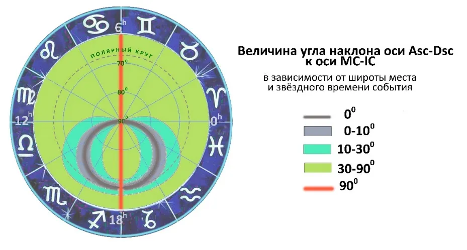 На рис. 10 показано, как меняется величина угла между осями Asc-Dsc и MC-IC в полярных широтах в процессе суточного вращения Земли (вычисления произведены при помощи астропроцессора Zeus). Оценка результатов расчёта показывает, что на любой широте, в большую часть суточного времени, может быть построена полноценная система Домов. В ту часть суточного времени, когда угол между осями Asc-Dsc и MC-IC мал, следует толковать этот факт в соответствии с общей картиной натальной карты.