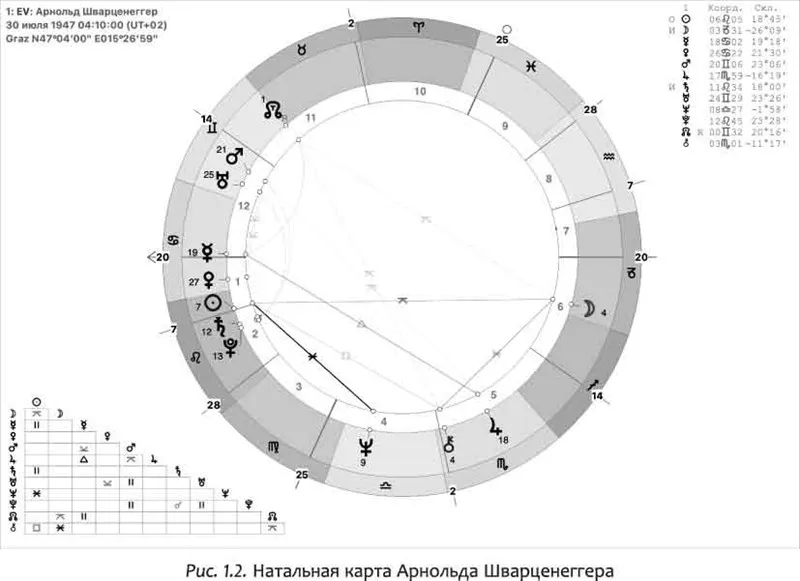 Обратите внимание на Юпитер Шварценеггера, управитель 10-го и 6-го домов, расположенный в 5-м доме. Мы можем предположить, что этот человек достигнет профессионального успеха и найдет свою повседневную работу, занимаясь делами 5-го дома, например соревнуясь или реализуя творческие способности. На мой взгляд, символизм Юпитера (стремящегося к экспансии) созвучен со стремлением бодибилдеров увеличить мышечную массу, а положение Юпитера в Скорпионе делает акцент на сексуальной привлекательности как одной из существенных граней культуризма. Интересно также положение Луны, управительницы Асцендента, диспозитора двух личных планет, Меркурия и Венеры (что повышает ее значимость). Она находится в 6-м доме работы, в знаке изгнания, в Козероге. На мой взгляд, это очень символично: Шварценеггер проводил (возможно, и проводит до сих пор) значительную часть своей жизни, работая (6-й дом) над своим телом (Луна, управитель Асцендента) дисциплинированно, систематически, не позволяя никаких излишеств (Козерог), в том числе строго контролируя питание (Луна, Козерог).