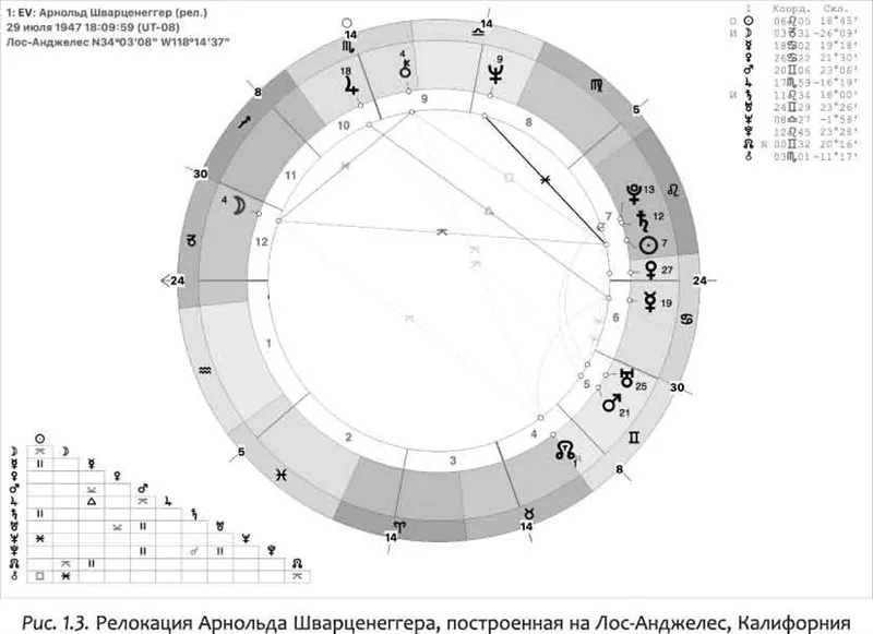 Однако, возвращаясь к Юпитеру, ось 5-го и 11-го домов неформальна. То, что происходит в этих домах, может быть очень интересно и желанно для человека, но имеет шанс остаться на уровне увлечения или хобби. Возможно, если бы Шварценеггер остался в Австрии, он стал бы бодибилдером-любителем, хотя и весьма успешным. Однако он переехал в США, в Калифорнию. На рис. 1.3 показана карта релокации, построенная на Лос-Анджелес.