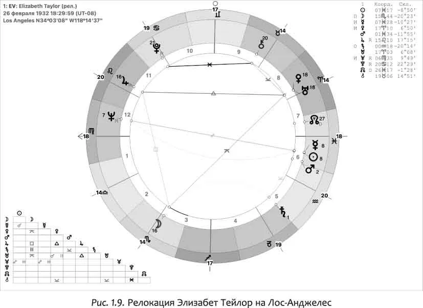 Точное соединение Меркурия и Солнца (так называемый Меркурий «в сердце Солнца») характеризует ее как обладательницу незаурядного типа мышления, однако важнее здесь другая конфигурация. Венера, управительница МС, точно соединяется в Овне в 5-м доме с Ураном, указывая на яркий, необычный творческий талант, приносящий успех в обществе – особенно если учесть трин от этого соединения к управителю Асцендента Юпитеру, а также замкнутую конфигурацию (так называемый «мистический треугольник») с Луной. Глядя на эти аспекты и положение планет в домах, мы можем быть уверены, что Элизабет никого не оставит равнодушной. Однако в Лондоне, месте ее рождения, она прожила недолго, и в возрасте 7 лет вместе с родителями переехала в Лос-Анджелес, где и достигла ошеломляющего успеха в Голливуде. Логично было бы увидеть нечто особое в релокации Элизабет Тейлор на Лос-Анджелес. Она показана на рис. 1.9.