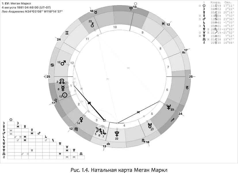 Предвещает ли натальная карта Меган сколько-нибудь успешную карьеру или заметное положение в обществе? Я бы в этом усомнился: управитель МС Марс спрятан в 12-м доме и расположен в знаке своего падения. Действительно, Меган вспоминает, что в начале карьеры у нее были трудности с получением ролей, ей приходилось подрабатывать. Ради наиболее успешной из ее ролей в кино Меган пришлось проводить по девять месяцев в году в Торонто, то есть она фактически переехала туда. Логично было бы взглянуть на релокацию, построенную на Торонто, и эта карта показана на рис. 1.5. В ней управительницей МС становится Венера, расположенная в 1-м доме, – один из классических признаков успеха, хотя успеха ограниченного, ведь Венера расположена в знаке своего падения.