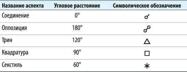 Под аспектом в большинстве случаев понимается определенное угловое расстояние между планетами, измеряемое вдоль эклиптики. Основные, наиболее важные аспекты (их еще называют мажорными) перечислены в таблице 1.3.