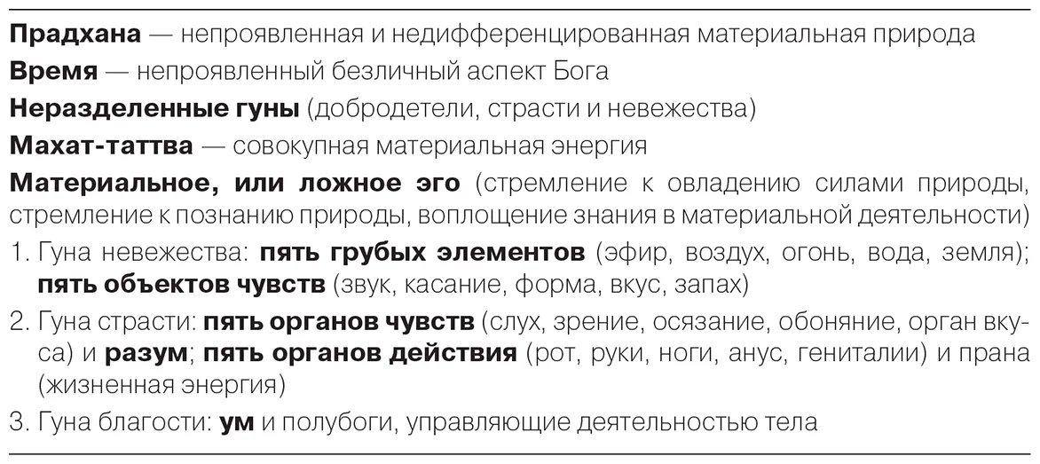 Таким образом, восемь внешних энергий Господа образуют двадцать четыре компонента материального мироздания (махат-таттва, ложное эго и т. д.), составляющих предмет аналитической философии, санкхьи, изучающей проявления Сверхдуши в окружающем мире. Из этих двадцати четырех начал состоит так называемое поле деятельности живых существ, на котором действует их ложное эго. Двадцать пятым элементом является время, по воле Всевышнего соединяющее различные материальные элементы и запускающее процессы разрушения. Так выглядит потрясающая панорама сотворения материального мира.