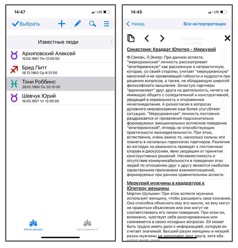 Можно смотреть интерпретацию аспектов – для натальной карты и для синастрии. Интерпретации неплохие, ими вполне можно пользоваться.