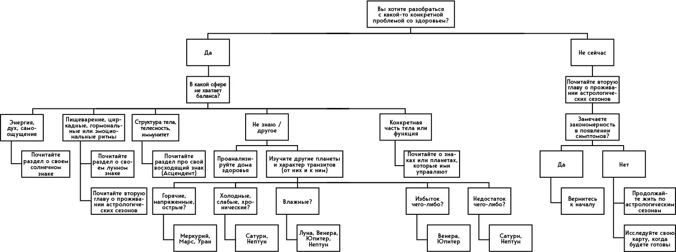 Основные элементы вашей натальной карты – это знаки, планеты и дома. Когда вы научитесь в них разбираться, можно будет добавить к этому аспекты и транзиты. Возможно, вы уже знакомы со всеми этими понятиями, однако в астрологии тела они приобретают совершенно новые особые значения. Как вы уже знаете, я за то, чтобы работать со всеми двенадцатью знаками, и надеюсь, вы тоже! Однако нужно признать, что какие-то из знаков, планет и других показателей карты влияют на ваше тело сильнее остальных. Сейчас мы разберем основные компоненты карты и посмотрим, как они влияют на здоровье. Затем мы посмотрим, какие элементы вашей карты наиболее ярко проявляются именно в вашем организме. Это разделы из второй части, которые будут вам особенно важны. Имейте в виду, что в описании знаков вы не найдете исчерпывающей информации (астрология всегда таит в себе более широкие трактовки), однако это хорошая отправная точка. Чтобы разобраться, откуда начать, воспользуйтесь схемой ниже. Обращайтесь к ней, когда почувствуете что-то новое в теле. Она поможет вам понять, какие знаки, планеты или части карты сейчас, скорее всего, активизированы.