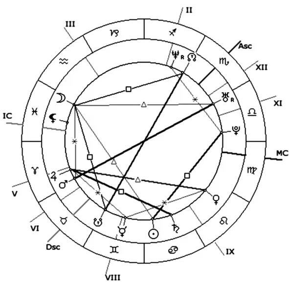 Также интересна связь Марса в Овне и Урана в Весах. Эти планеты образуют точный аспект оппозиции и вносят в карту интенсивность, что проявляется в жизни как независимость мышления в активной деятельности, стремление в лидерству и покорению новых вершин. Кроме того, Луна в Рыбах придает эмоциональную восприимчивость, способность к сопереживанию и эмпатии, умение целостно и свысока охватывать психологическую составляющую своей жизни и жизни окружающих.