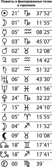 Пример рабочего гороскопа. Солнце находится в Козероге в 6-м Доме (☉ ♑ 6 Дом), Луна в Козероге в 5-м Доме (☽ ♑ 5 Дом), Марс в Тельце в 10-м Доме (♂ ♑ 10 Дом) и т. д. Зная вибрации планет и знаков зодиака, разбираясь в том, что они символизируют, и, умея это все интерпретировать, ты сможешь дать характеристику, увидишь событие, узнаешь, где оно будет проходить.