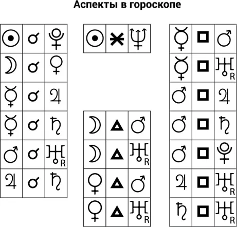 Планеты, взаимодействуя между собой, образуют аспекты, за счет которых происходит детализация реальности в твоей жизни. На рисунке это линии. Они указывают на напряженные или гармоничные ситуации, на что ты должен обратить внимание, что ты должен учесть. Цвет линии (красный, зеленый) отвечает: гармоничный или напряженный тот или иной аспект. (Рис. 2.1.) Аспекты могут быть прописаны рядом с гороскопом или вынесены в отдельную таблицу.