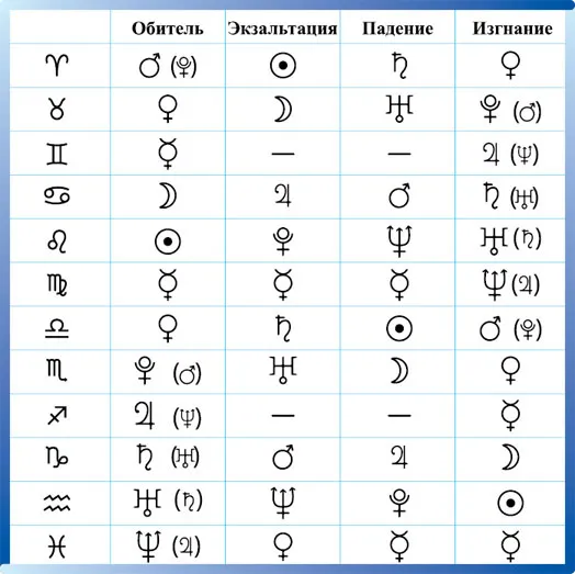 Когда ты рассмотришь свои планеты, в знаках зодиака используя таблицу на рис. 2.7, то сможешь увидеть свои имеющиеся качества, фундамент, которым ты владеешь, а также сможешь увидеть качества, которые возможно надо наработать для достижения определенных целей. Обитель тебе укажет на твой природный ресурс. Экзальтация укажет на твой потенциал, а падение и изгнание на дефицит или отсутствие качеств. Характеристики качеств смотри в разделе 3. знаки зодиака и их характеристики.
