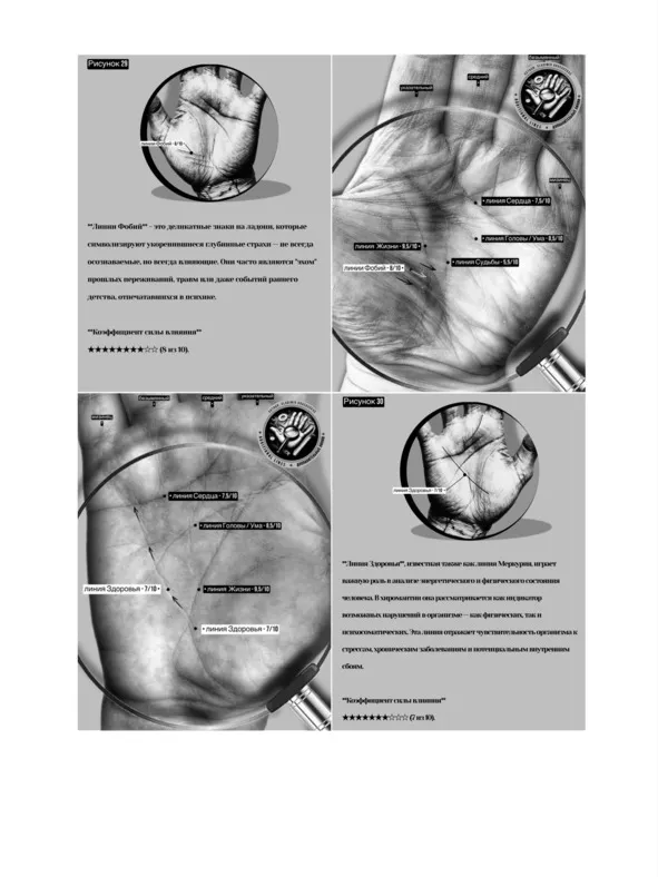 Чёткость, непрерывность и форма линии Здоровья тоже имеют большое значение. Чем более ясной и ровной выглядит линия, тем стабильнее состояние здоровья. Наличие разрывов, островков или пересечений может указывать на дисбаланс в организме или скрытые заболевания.