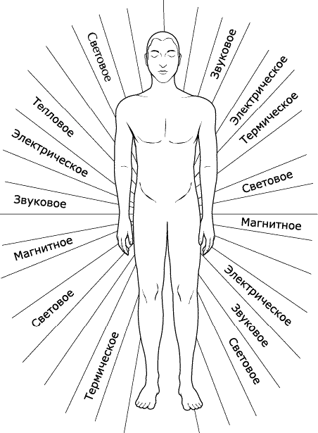Приятно жить в такое время, когда современная наука и технология имеют возможности обнаруживать и контролировать любые энергетические поля, и особенно те, которые принадлежат человеческому телу. Согласно данным современной науки, человеческое тело состоит из энергетических полей. Энергетические излучения, идущие от тела, включают в себя электрические, магнитные, звуковые, тепловые, световые и электромагнитные поля (см. рис. 5). Некоторые из этих энергетических полей создаются внутри тела. Другие поля тело получает извне, и затем они преобразуются. Данный процесс происходит за счет естественного взаимодействия между энергетическими полями. Такое взаимодействие мы подробно опишем в этой главе. Оно может рассматриваться как особого вида естественный осмос между вашими энергиями и энергиями окружающего вас мира: вы поглощаете энергию растений, деревьев, цветов, животных и даже самой земли.