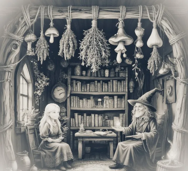Ей интересно было узнать, как там внутри у него всё обустроено. Вскарабкавшись по высокой лестнице, она открыла тяжелую деревянную дверь и заглянула вовнутрь. Дом заинтересовал её сразу с первых секунд, она впервые видела такое убранство: по стенам было развешено много пучков различных ароматных трав, полочек с непонятными баночками и много всего ещё интересного. В углу стоял причудливый посох из дерева, по углам были развешены нити с сушеными грибочками.