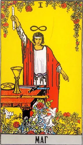 Символика этой карты объединяет все 4 масти (стихии) младших арканов и над головой Мага знак бесконечности (знак бесконечности – символ цикличности, повторения одной и той же ситуации). Само собой, по этой карте мы можем сказать, что человек знает, что он делает и для чего. В руках у него жезл, что говорит ещё о способностях самого человека к чему-либо в том числе и к магии. По общей картинке можно сделать ещё вывод, что карта указывает на то что есть все инструменты и возможности для действия(й) и, если смотреть именно самого мага он уже совершает действие и для этого у него всё готово и находится под рукой.