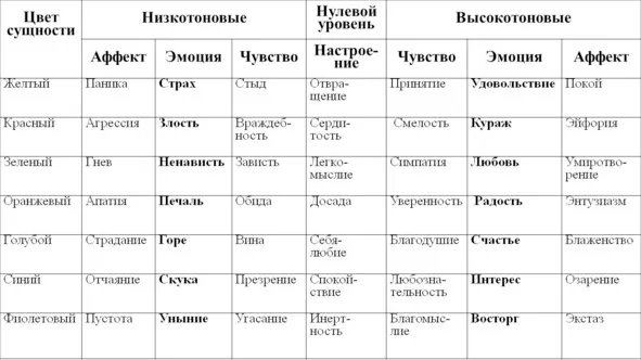 Таб. 4. Азбука эмоций – эмоэнграмм по тонам, интенсивности, цвету сущности