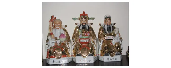 Бог Сау или Шоу является богом долголетия. Бога Шоу изображают как старца с большим и лысым лбом, одной рукой он опирается на большой посох, к которому привязана тыква Ху-Лу, а в другой руке держит плод бессмертия – персик. Иногда рядом с ним изображают журавля или оленя, являющихся символом бессмертия. Используйте изображение бога Шоу для благословления главы семьи или старшего члена семьи. Фигурку Бога Шоу, как и фигурки других богов, следует ставить около стены и не низко, желательно ставить их на уровне глаз.
