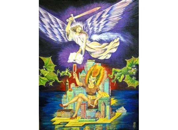 И пришел один из семи Ангелов, имеющих семь чаш, и, говоря со мною, сказал мне: подойди, я покажу тебе суд над великою блудницею, сидящею на водах многих, с нею блудодействовали цари земные, и вином ее блудодеяния упивались живущие на земле. И повел меня в духе в пустыню, и я увидел жену, сидящую на звере багряном, преисполненном именами богохульными, с семью головами и десятью рогами. И жена облечена была в порфиру и багряницу, украшена золотом, драгоценными камнями и жемчугом, и держала золотую чашу в руке своей, наполненную мерзостями и нечистотою блудодейства ее, и на челе ее написано имя: тайна, Вавилон великий, мать блудницам и мерзостям земным. Я видел, что жена упоена была кровью святых и кровью свидетелей Иисусовых, и, видя ее, дивился удивлением великим (Откр.14:1—6).