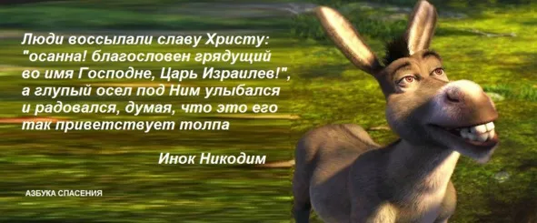 Архимандрит: «Напрасно хвалите меня, я всего лишь осел, на котором въезжал Господь в Иерусалим». Люди воссылали славу Христу: осанна! благословен грядущий во имя Господне, Царь Израилев!, а глупый осел под Ним радовался, думая, что это его так приветствует толпа.