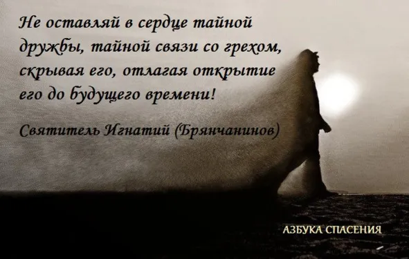 Не оставляй в сердце тайной дружбы, тайной связи со грехом, скрывая его, отлагая открытие его до будущего времени! Иначе твое покаяние будет неистинным, лицемерным, в душе твоей будет оставаться залог, причина к продолжению жизни греховной. Неисповедуемые согрешения удобно повторяются, как бы совершаемые в непроницаемой тьме. С решительностью возненавидь грех! Измени ему обнаружением его – и он убежит от тебя, обличи его как врага – и примешь свыше силу сопротивляться ему, побеждать его.