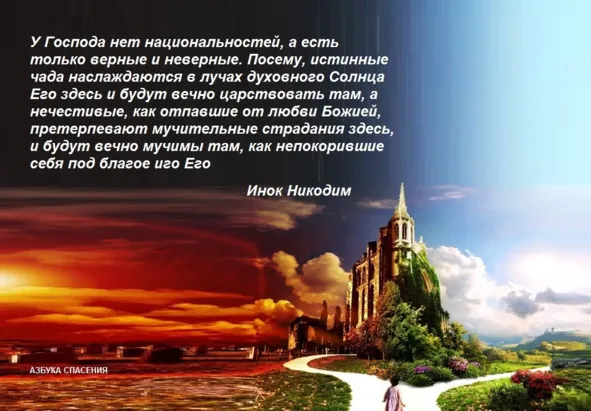 Два есть пути, один другому противоположные, – путь широкий и пространный, и путь тесный и скорбный. Два также путеводителя, и каждый из них старается обратить к себе. На пути гладком и покатом путеводитель обманчив – это лукавый демон, и он посредством удовольствий увлекает следующих за ним в погибель, а на пути негладком и крутом путеводителем добрый Ангел, и он чрез многотрудность добродетели ведет следующих за ним к блаженному концу.