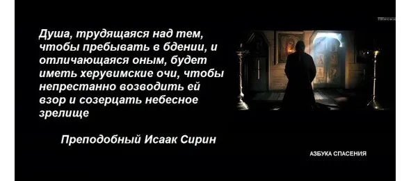 Не думай, человек, чтобы во всем иноческом делании было какое-либо занятие важнее ночного бдения. Подлинно, брат, оно и важно, и весьма необходимо для воздержного. Если у подвижника не будет рассеяния и возмущения делами телесными и попечением о преходящем, но соблюдет он себя от мира, бдительно будет охранять себя, то ум его в краткое время воспарит как бы на крыльях и возвысится до услаждения Богом, скоро приидет в славу Его и по своей удободвижности и легкости погрузится в ведении, превышающем человеческое понятие. Если монах с рассудительностию пребывает во бдении ума, то увидишь в нем как бы неплотоносца. Ибо подлинно это дело ангельского чина. Невозможно, чтобы те, которые всю жизнь проводят в этом занятии, оставлены были Богом без великих дарований за их трезвенность, бодрственность сердца и попечительное устремление к Нему помыслов своих. Душа, трудящаяся над тем, чтобы пребывать в сем бдении, и отличающаяся оным, будет иметь херувимские очи, чтобы непрестанно возводить ей взор и созерцать небесное зрелище.