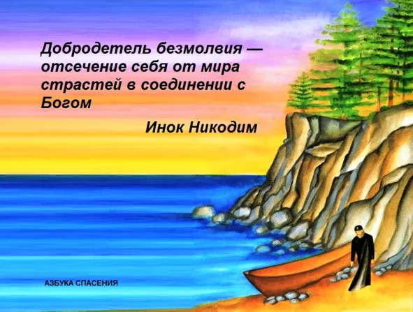 Добродетель безмолвия – это отсечение себя от мира плотских страстей и соединение с Богом. Таков закон Духа, ибо неложен Тот, Который заповедал: Никто не может служить двум господам: бо, или одного будет ненавидеть, а другого любить, или одному станет усердствовать, а о другом нерадеть. Не можете служить Богу и маммоне (Мф.6:24).