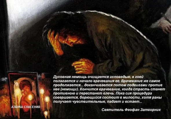 Духовная немощь очищается исповедию, в коей полагается и начало врачевания ее. Врачевание же самое продолжается… доканчивается потом подвигами против нее (немощи). Кончится врачевание, когда страсть станет противною и перестанет влечь. Пока сия процедура совершается, борющийся состоит в милости, хотя раны получает чувствительные, падает и встает.